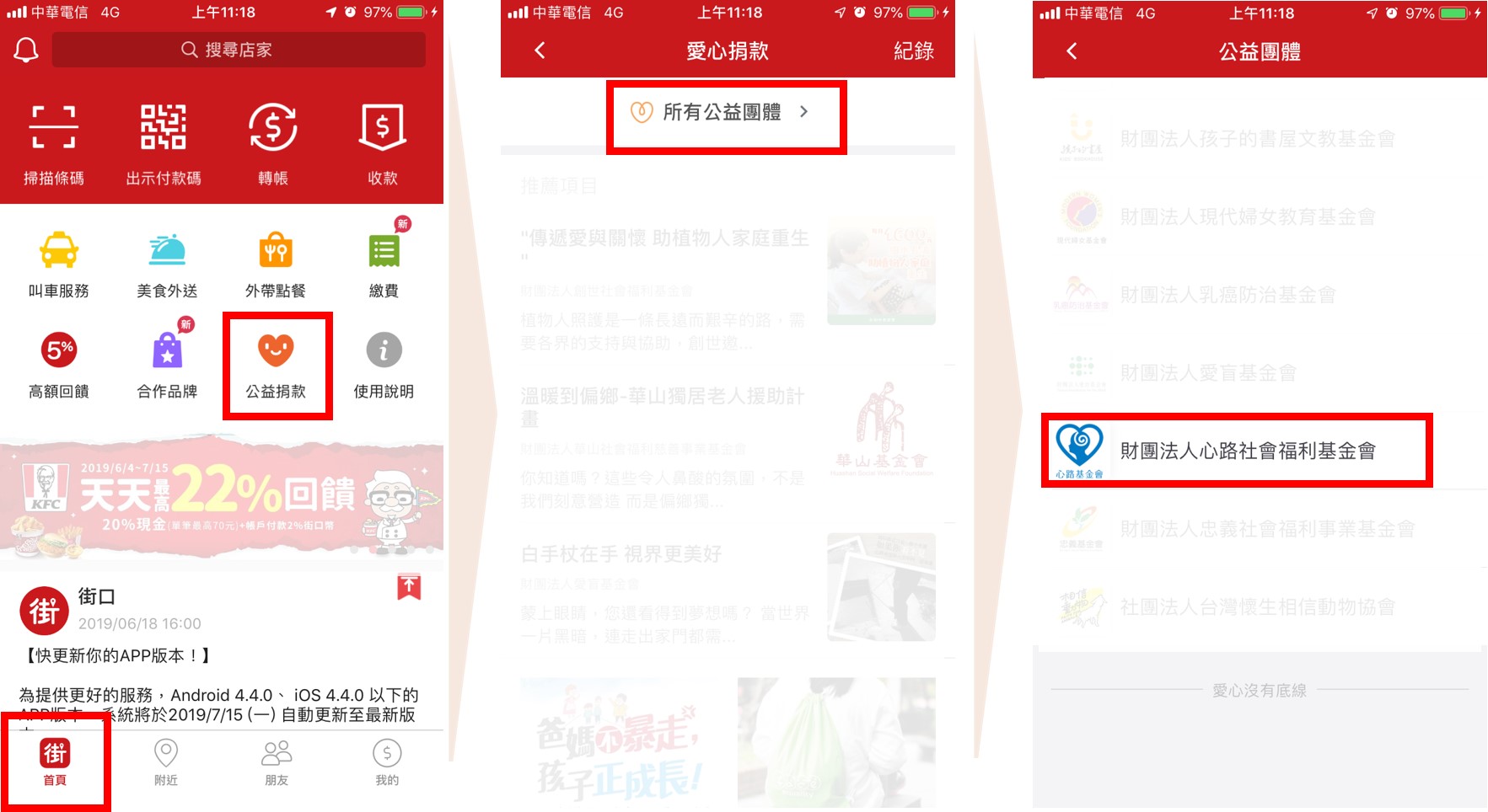 1. 打開手機內的【街口支付】APP,選擇 首頁 → 公益捐款,選擇 [所有公益團體] 後,點選 財團法人心路社會福利基金會。