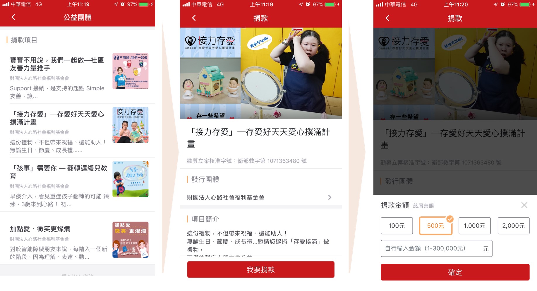 如果您是【街口支付】APP的用戶,並有綁定信用卡或銀行帳戶,您可以使用「公益捐款」捐款給心路喔!