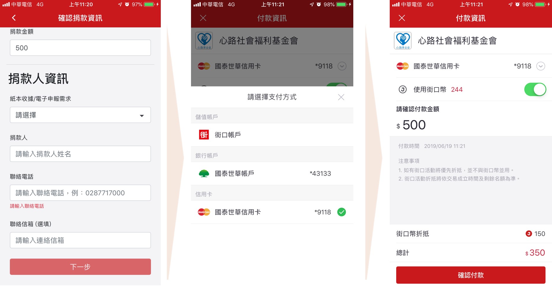 3. 填寫 [捐款人資訊] 後點選 [下一步] (請務必選擇正確您要 "電子收據"或"紙本收據"),選擇帳戶或信用卡付款及是否使用街口幣,確認完成後點選 [確認付款] 就完成捐款了。
