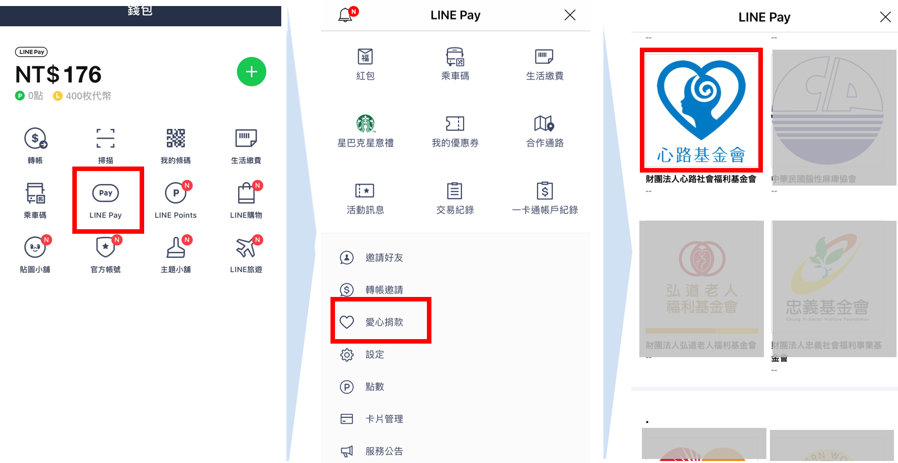 如果您是Line的用戶,並有綁定信用卡或銀行帳戶,您可以利用Line當中的【Line Pay】功能捐款給心路。