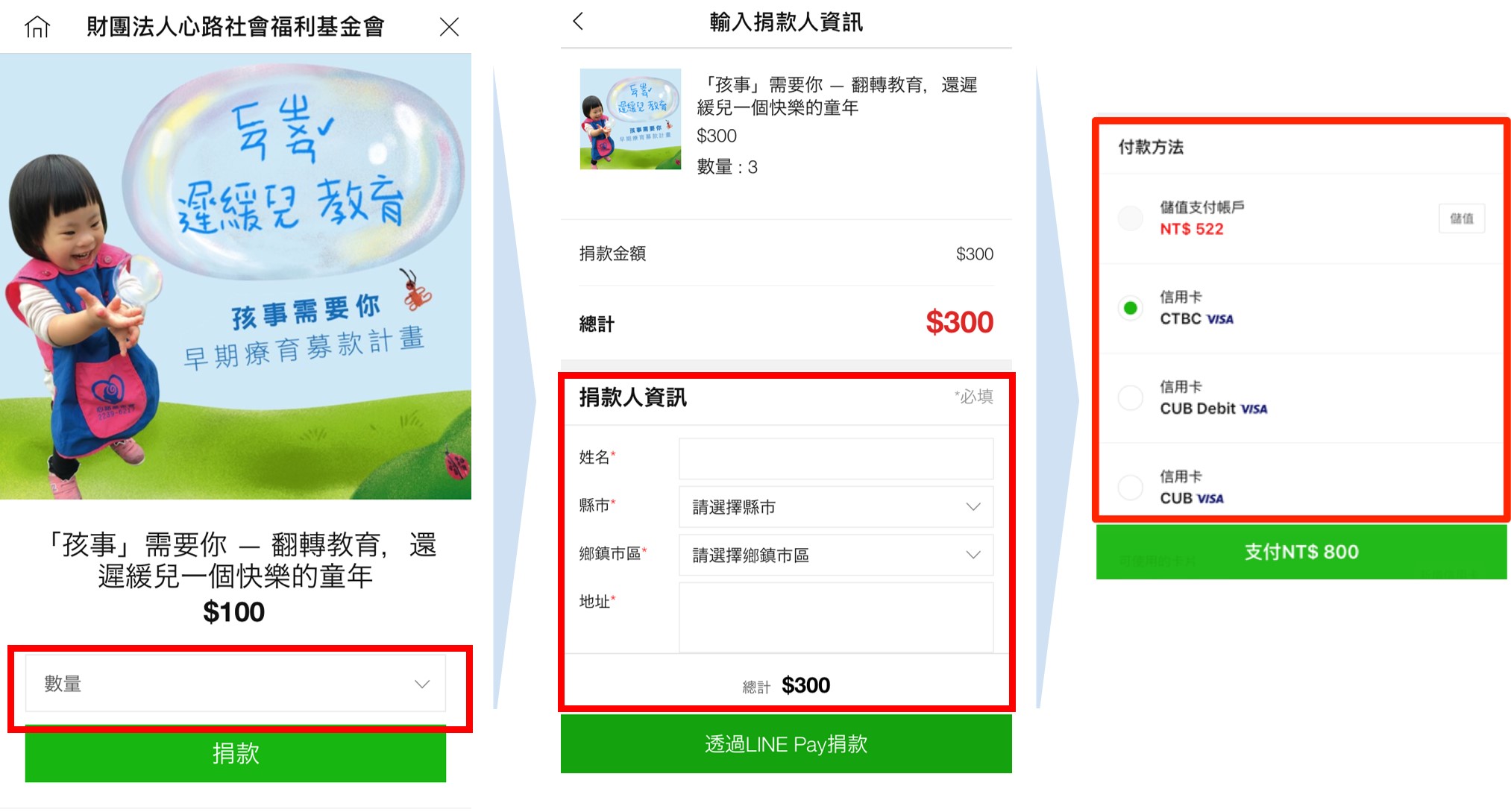2. 選擇要捐款的募款案、數量 點擊[捐款]按鍵,並填寫捐款資料及選擇付款方法,點擊[支付]就完成捐款了。