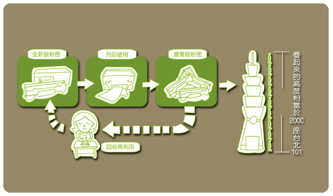 經統計,台灣每年約有300~400萬支碳粉匣,平均回收率卻只有5%。