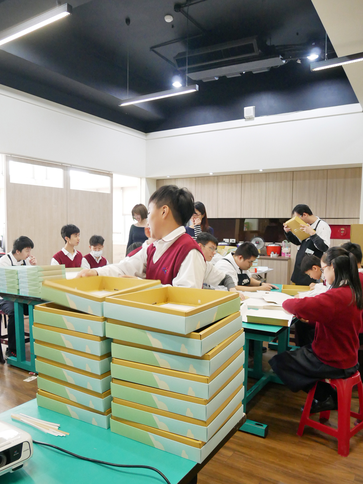 學生與庇護員工一起動手摺紙盒。