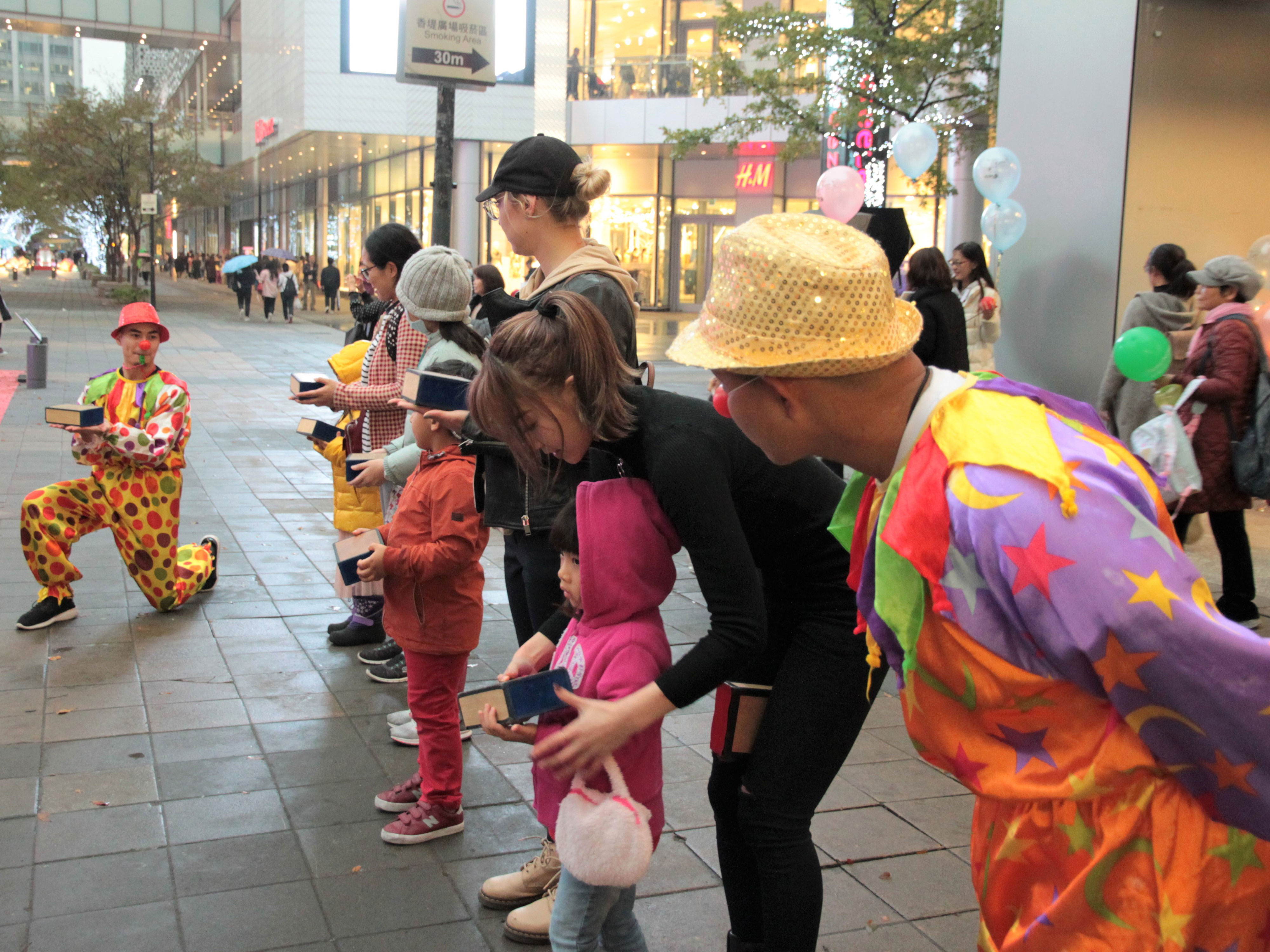 補班補課的2月23日午後,智能障礙者阿超、小健、緯緯、小茹,以及艾肯娛樂吉祥物「熊寶」領軍,快閃信義區香堤廣場,與心路及艾肯的工作人員一起,以暖暖微笑,邀請300多位民眾參與微笑募集活動,街頭藝人「發現特技劇場」也響應,帶來精彩表演,號召觀眾拍下微笑大合照,讓涼風陣陣的街道湧現暖意。