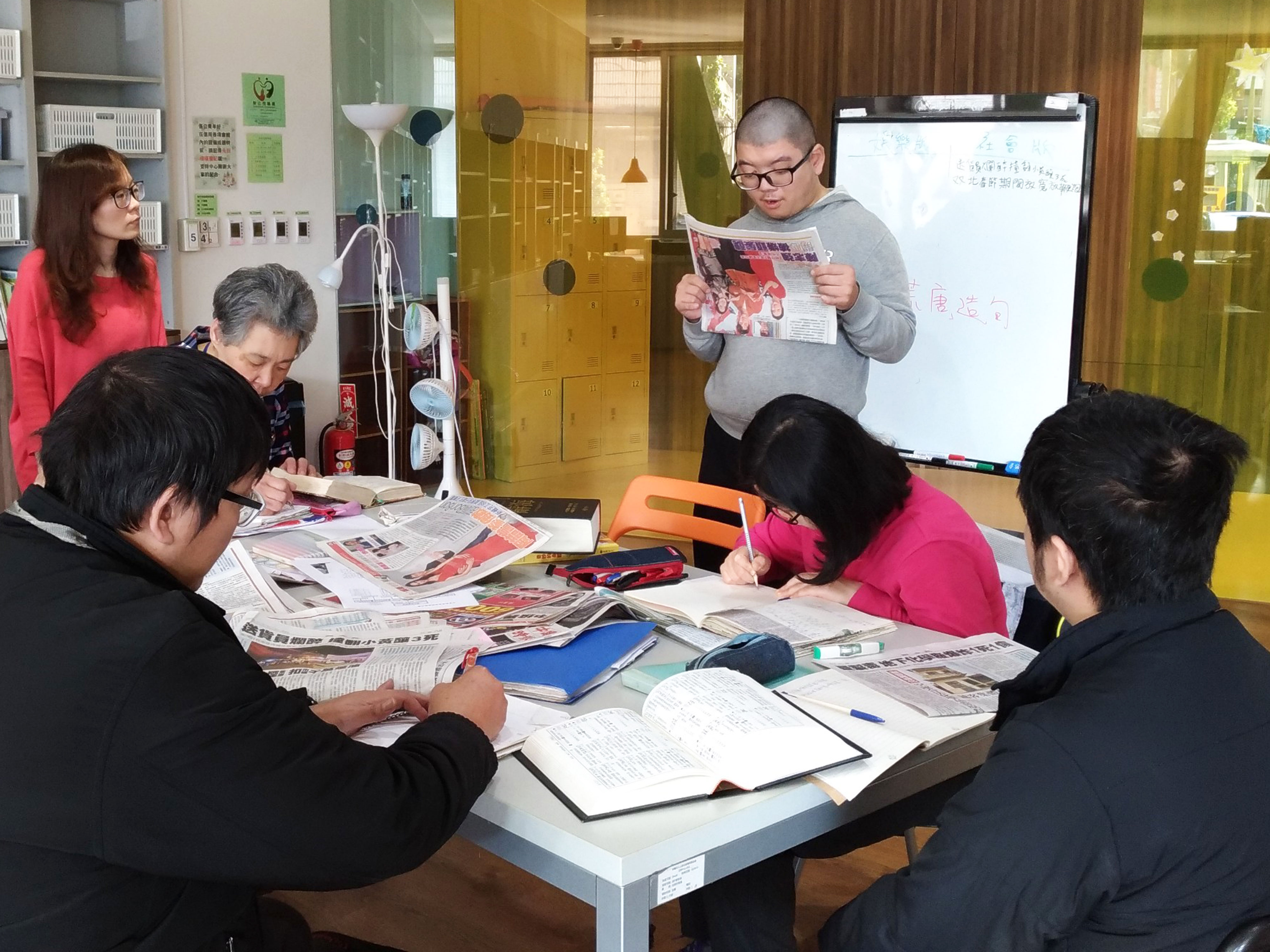 阿超在讀報課上,學習新知、練習表達。