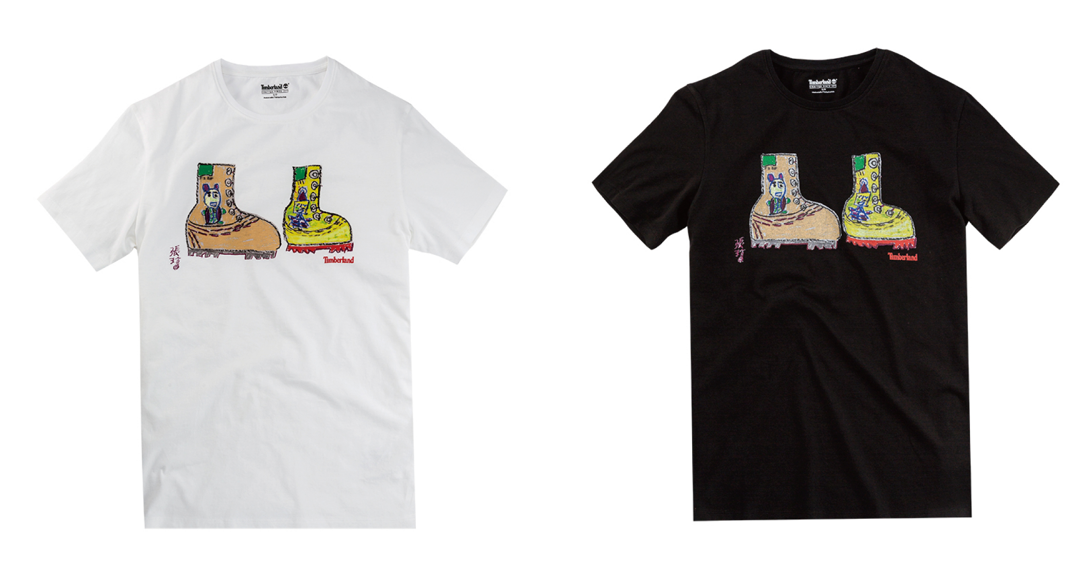 Timberland與心路除了合作舊衣捐贈,更推出聯名T-shirt,由心路大朋友手繪黃靴為T-shirt主要視覺,共有黑、白兩色,