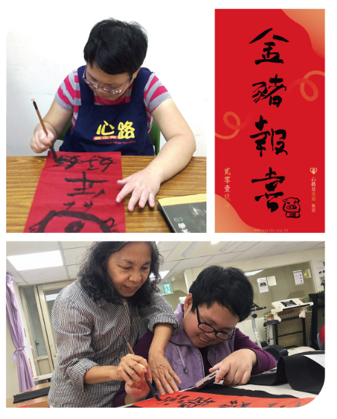 隨著年紀漸長,聰聰的視力逐步退化,但她仍喜愛藝術。教保員輕扶她的手、拿起毛筆定位、寫字,待墨水乾了後,再拿起字帖聞聞、仔細檢查。