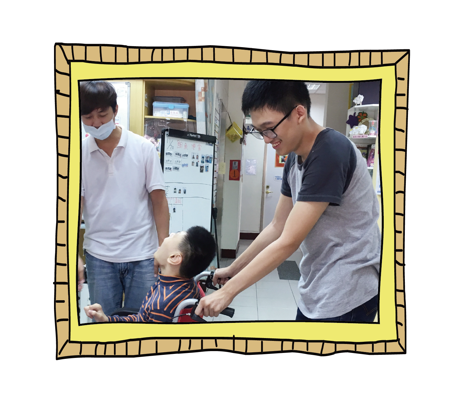 小康 助人開朗哥 「合體!」教保員一說出關鍵字,小康在另一端回答:「是!」過來幫忙推輪椅,小心避開四處走動的同伴,繞過桌子與柱子狹窄的空間,抵達目的地。 樂於助人的小康,做事仔仔細細,推輪椅的技術堪稱「新興馮迪索」。但他有時只顧著別人,把自己的事都忘了,教保員也會適時提醒他。 |