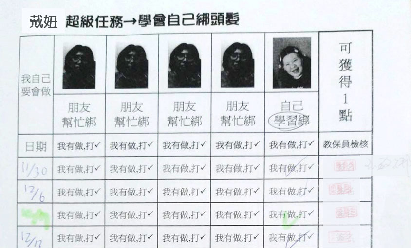 戴妞用表格了解每天的成長狀況,朝向獨立綁頭髮的目標邁進。