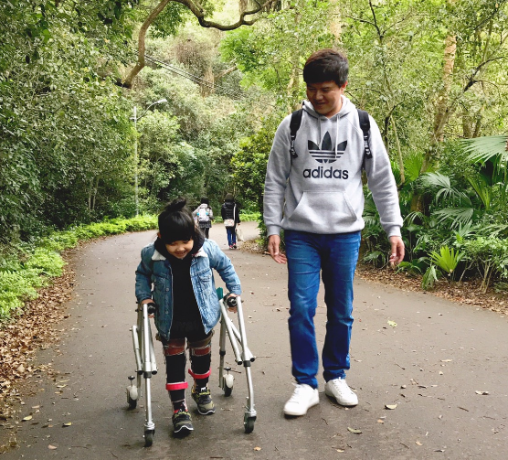 活動現場有許多的溫馨角落。「小樂加油!」爸爸眼冒愛心的看著寶貝女兒,展現練習多時的成果,努力用walker(助行器)走上坡。
